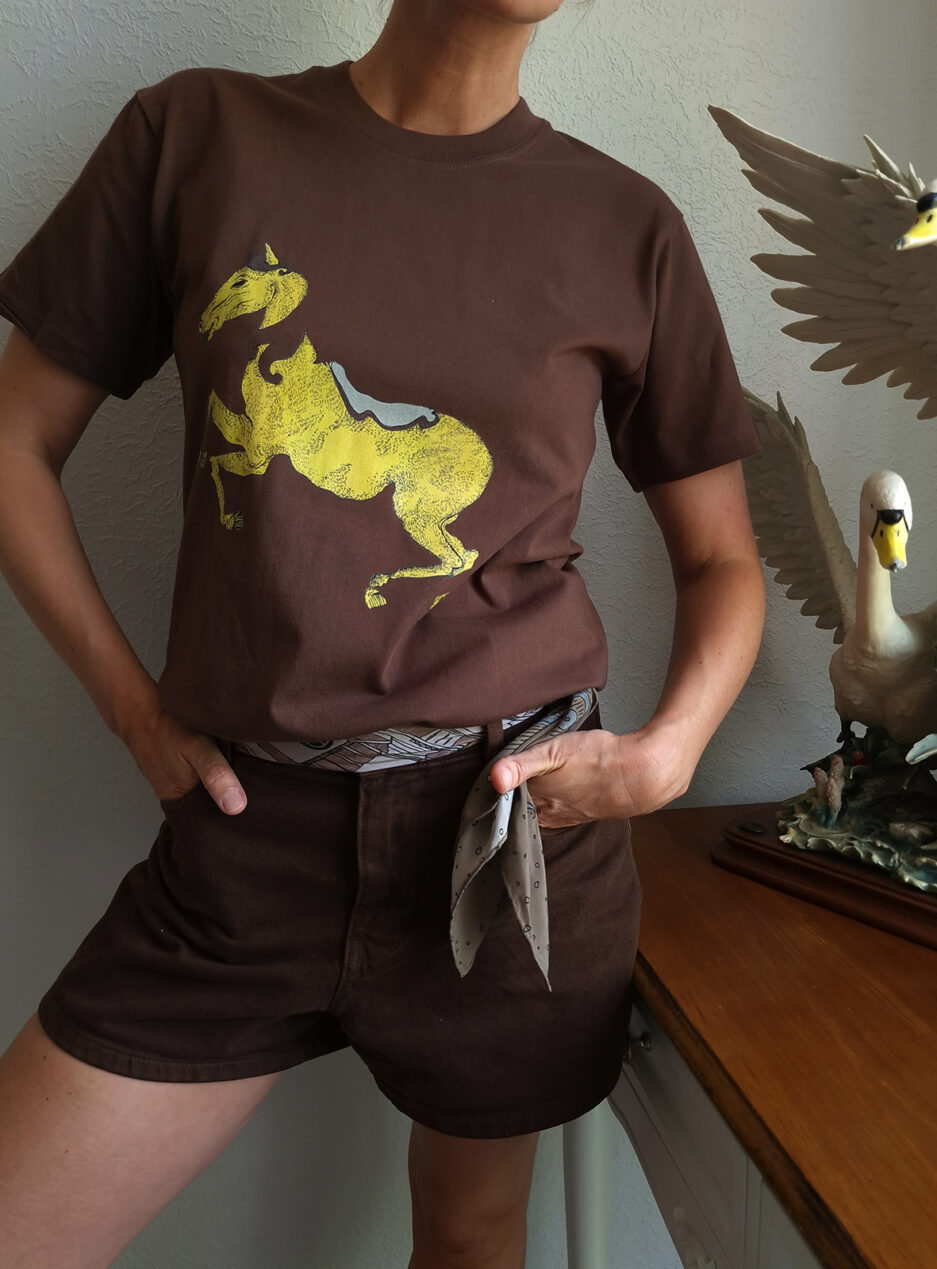 T-särgi muster on inspireeritud loodusest, mis keerleb kui karussell, on lõbus ja tuuline ning loob müstilist meeleolu igasse argipäeva. T-särk on valmistatud 100% pehmest ja hingavast puuvillast ning sobib ideaalselt igapäevaseks kandmiseks, kaunis tumeda šokolaadi baastoonides särk. Kitsama lõikega mudel, mis on saadaval suurustes S, M, L. 100% Puuvill